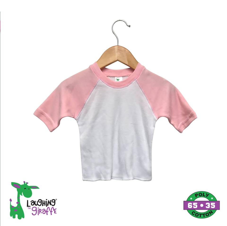 In stock and ready to ship. White is 100% Polyester and Pink Raglan is 65% polyester so perfect for sublimation.