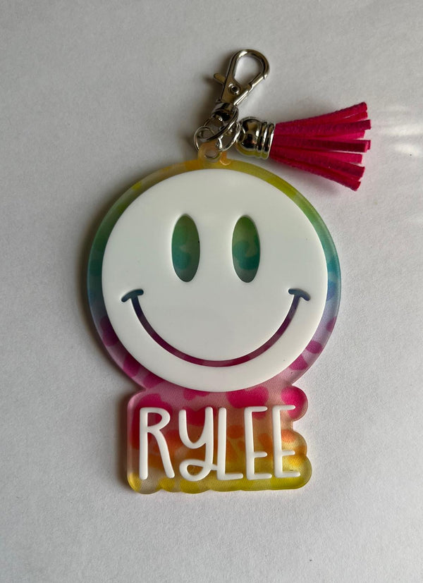 The Custom Acrylic Smiley Face Keychain is the perfect personalized accessory. Crafted with two layers of acrylic, this keychain will make your name truly shine. It's also equipped with hardware and a tassel, adding an extra blingy touch. Show off your personalized style with this stunning keychain!